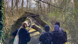 Movement, Migration and Manchester ran between December 2024 and June 2025 and was a collaboration between University of Manchester students, academic staff, people from the community who have experiences of migration to the city, Grass Routes Movement CIC, Manchester Museum and Castlefield Gallery. Through a series of six urban walks, one silent, and six creative workshops, we moved and made together, sharing experiences of free movement, reflecting on restrictions to the right to roam on domestic, bordered land and co-producing the project exhibition which captured our poetry, nature journals, embroidery, free movement zines, photography and voice. The overarching theme of the ‘hostile environment’ lay at the core of our gaze, both in how it impacts humans and our capacity to move freely, but also how the changing climate impacts nature, a process which itself has started to generate migrants in flight.